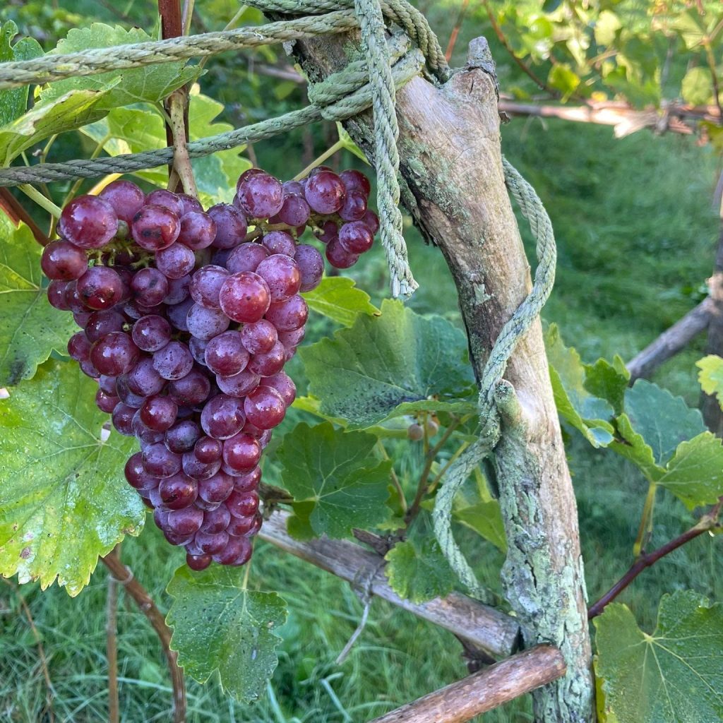 Drie soorten wijnstokken, geplant in de vorm van een blad. In de wijngaard wordt intensief met de natuur samengewerkt, zonder kunstmest of pesticiden.