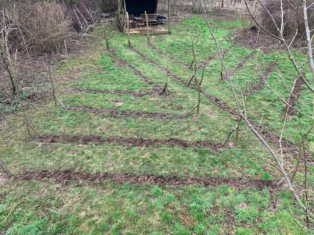 Oktober. De wijngaard wordt ondertussen vormgegeven door middel van draden te spannen tussen bamboestokken. De contouren worden voor het eerst duidelijk zichtbaar. We gaan het uitzetten in de vorm van de nerven van een blad. Grappig detail: precies door de kleine wijngaard loopt een dassenpad, herkenbaar aan het platgetrapte gras (maar of dit volgend jaar nog zo leuk zal zijn…).