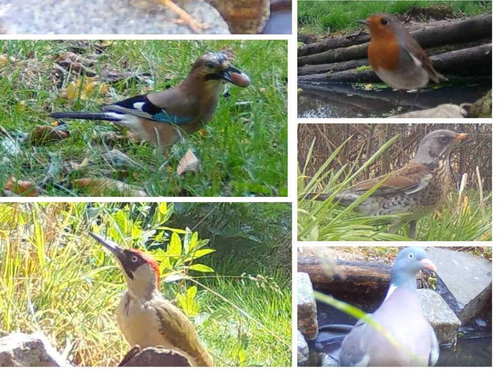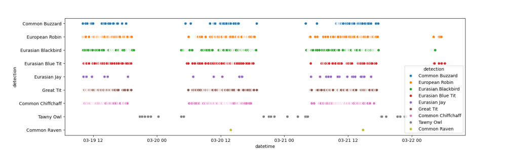 Alle vogelsoorten die we eerder via wildcamera’s hadden gezien, werden ook in de geluidsopnames teruggevonden, maar er kwamen nog meer soorten bij. De raaf, waarvan we al wisten dat hij in de buurt nestelt, is nu ook te horen. Daarnaast werd ook het nachtelijke geluid van de bosuil vastgelegd. Overdag lieten ook andere vogels zich horen, zoals roodborstjes, koolmezen, merels, spechten, duiven, en nog veel meer.